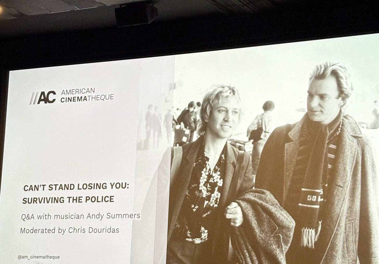 Can’t Stand Losing You (2012). Great documentary about Andy Summers and The Police. We watched it this past weekend at The Aero with Q&A with Summers.